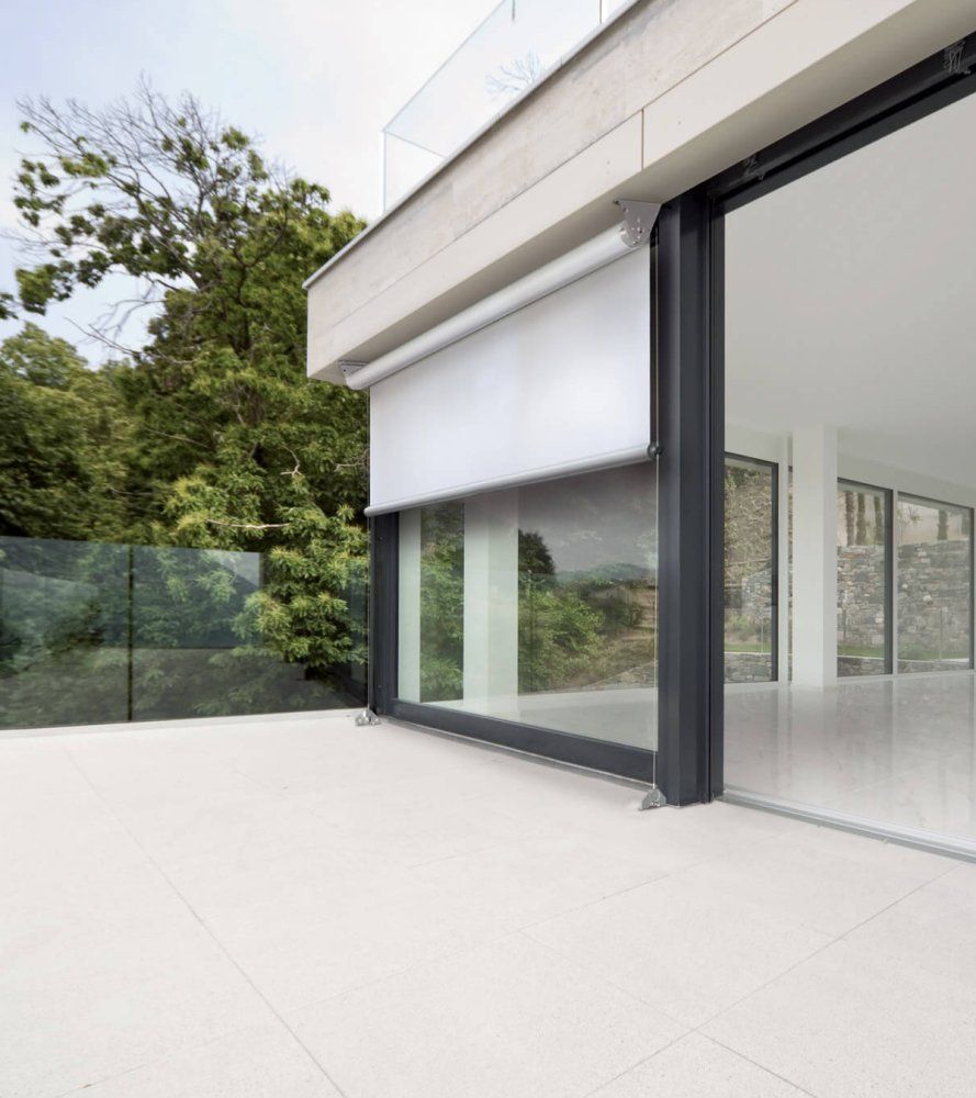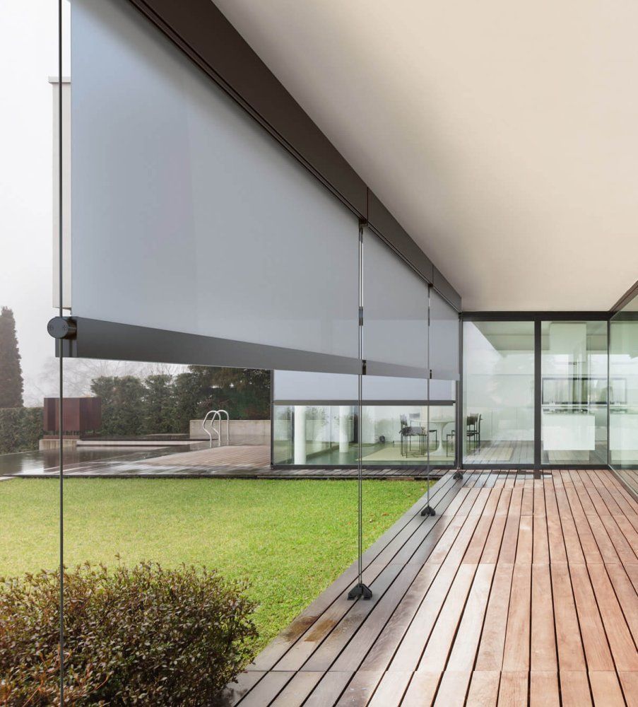 Tenda a rullo verticale priva di cassonetto, dal design innovativo e moderno, equipaggiata con una guida in cavetto inox dal diametro di 4 mm.